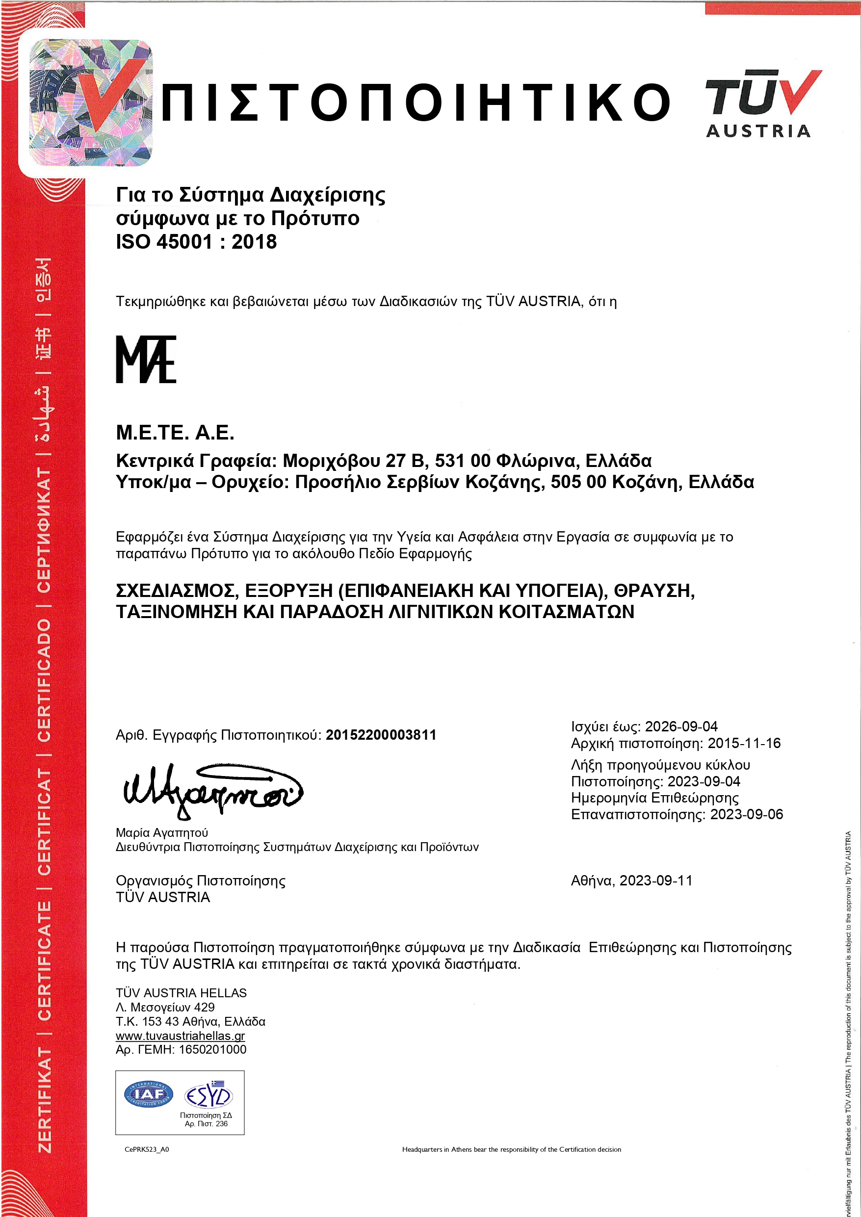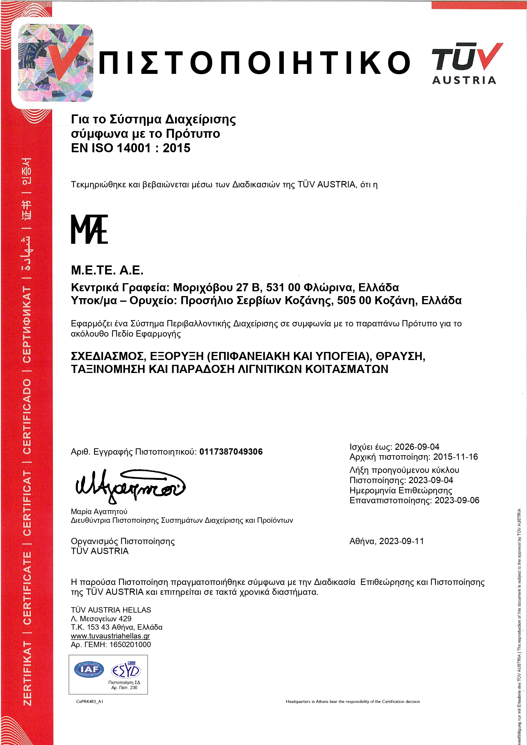 Η εταιρεία έχει πιστοποιηθεί από την TUV AUSTRIA κατά τα πρότυπα του EN ISO 9001: 2015 για το σχεδιασμό, εξόρυξη, θραύση, ταξινόμηση και διάθεση λιγνιτικών κοιτασμάτων.